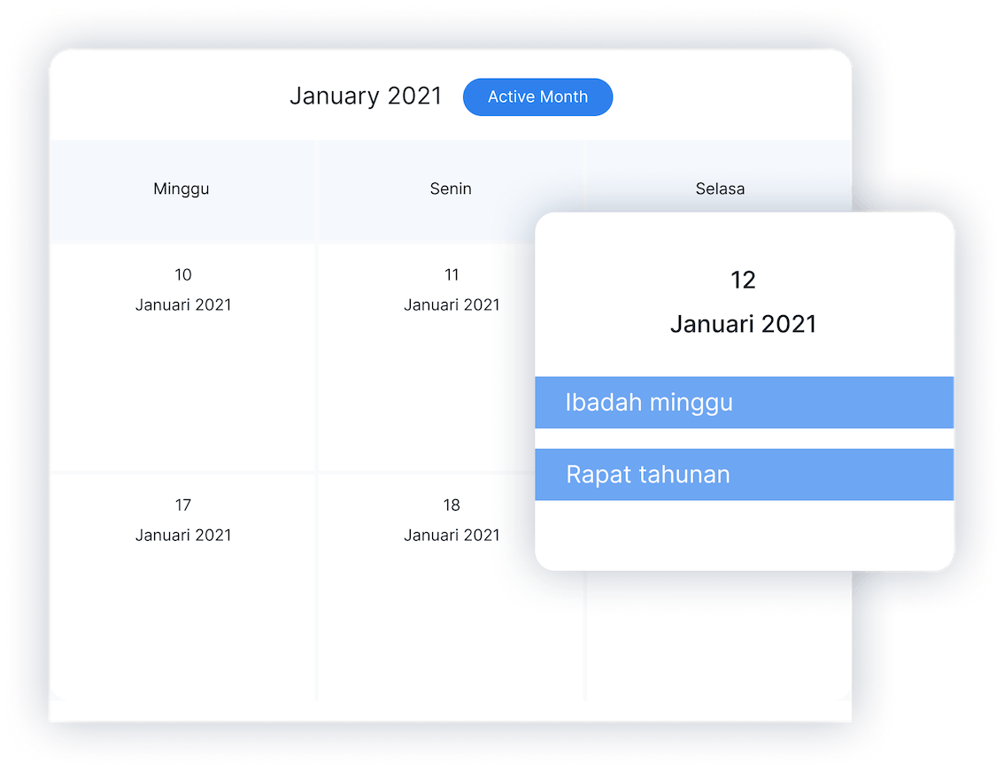 Kalender ibadah memudahkan pengurus dalam mengatur dan menjadwalkan ibadah/event. fitur template ibadah juga berguna untuk menetapkan ibadah dalam kalender