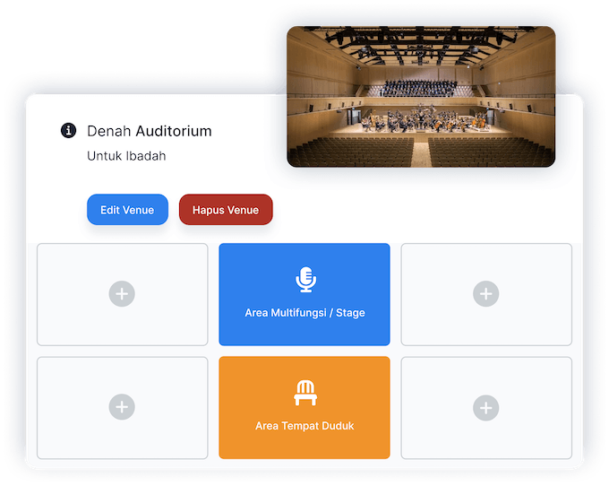 Jadwalkan event ibadah dengan mudah, dengan fitur mengatur layout venue dan tempat duduk.