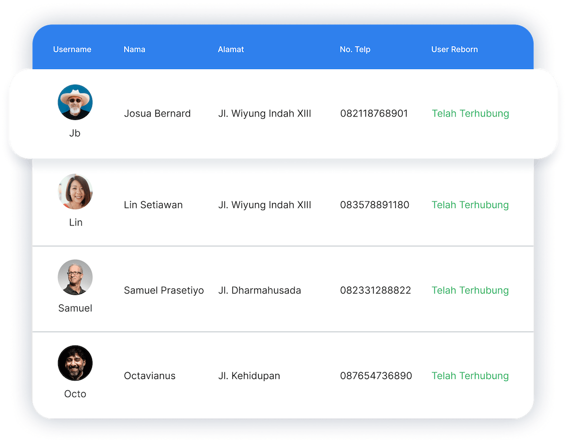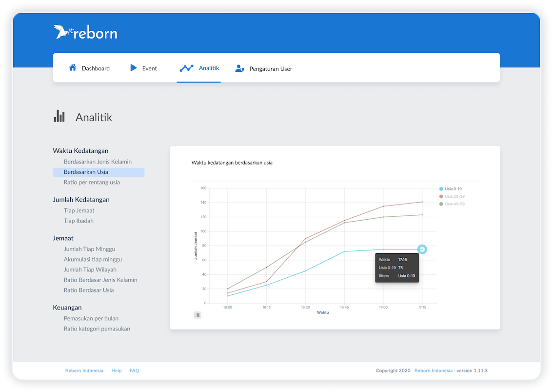 Reborn menyajikan analitik instan yang mampu memberi gambaran detil terkait perilaku jemaat. Hal ini menjadikan gereja mampu melakukan analisa lebih cepat untuk perencanaan dan pengembangan. Reborn mendukung gereja untuk memberikan pelayanan yang tepat, relevan dan optimal.
